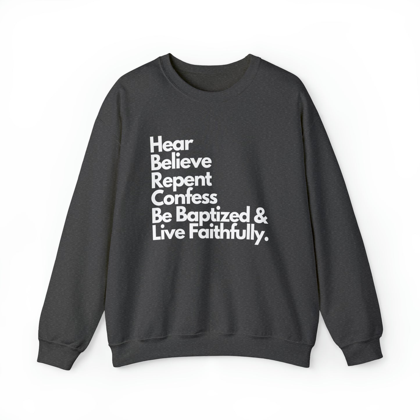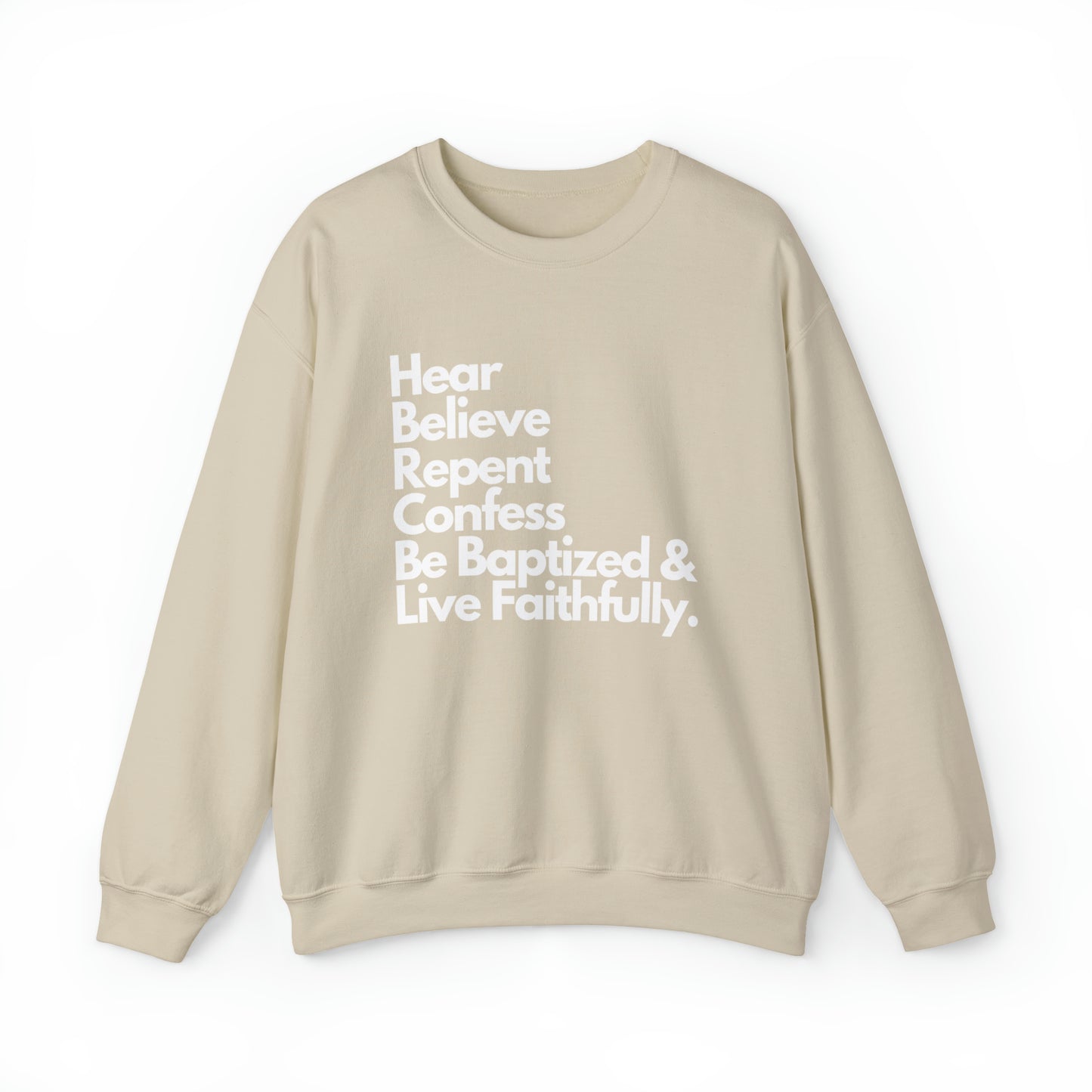Inspired by the core elements of the plan of salvation, each stage—'hear, believe, repent, confess, be baptized, and live faithfully'—is emblazoned in a captivating and stand-out print. The bold colors and impactful design make a striking statement, emphasizing the significance of each step on the path to becoming a christian.
